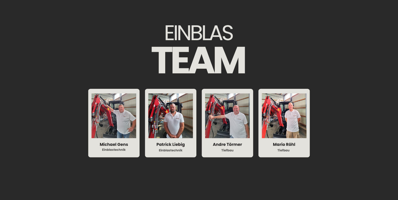 Unser Einblasteam besteht aus zwei Einblastechnikern und zwei Tiefbauern. Trotz dieser Schwerpunkte sind wir ein echtes Allround-Team: Jeder von uns beherrscht alle Bereiche – Einblastechnik, Tiefbau und Bohrtechnik. Dank dieser vielseitigen Ausbildung können wir flexibel arbeiten, uns gegenseitig unterstützen und jedes Projekt zuverlässig und effizient umsetzen.